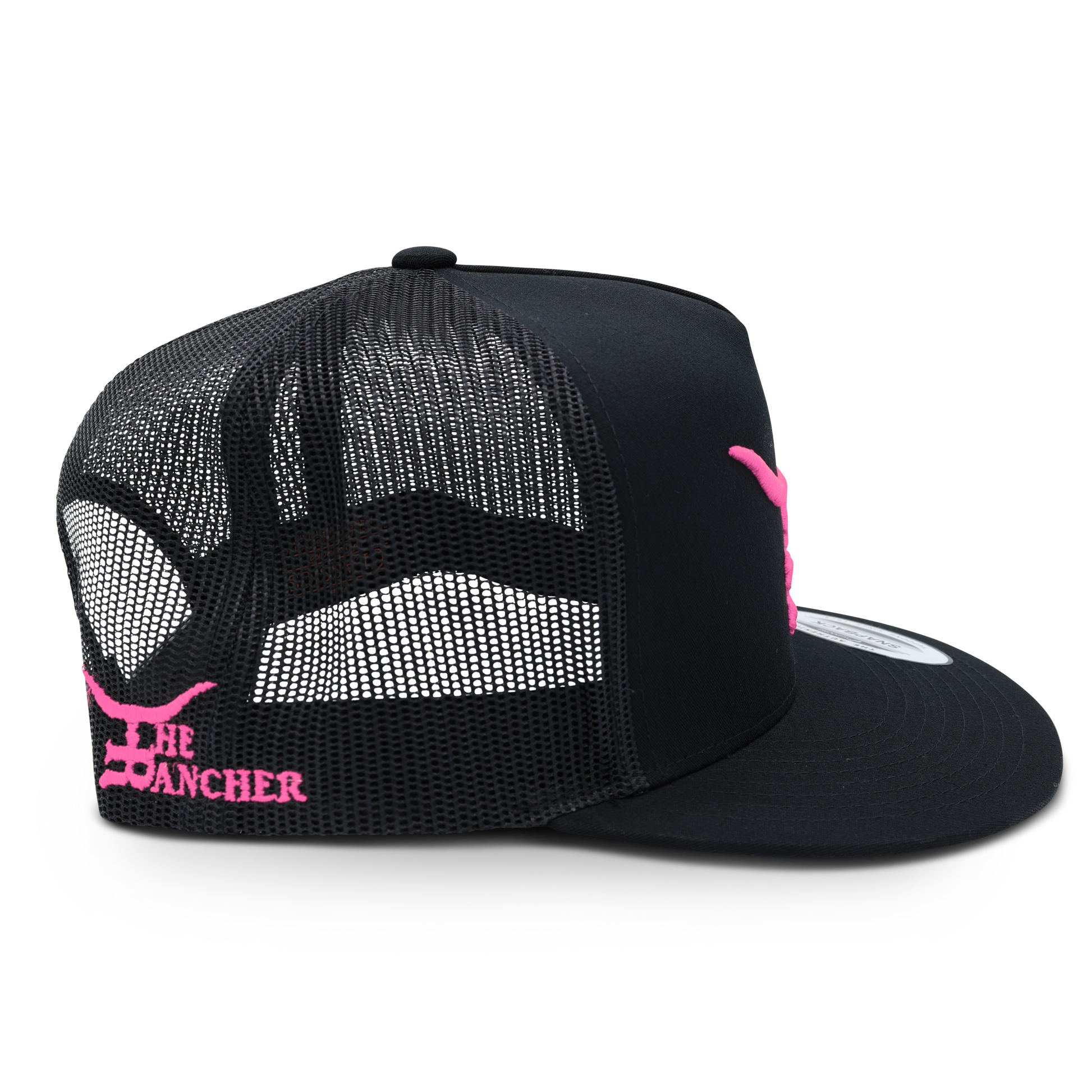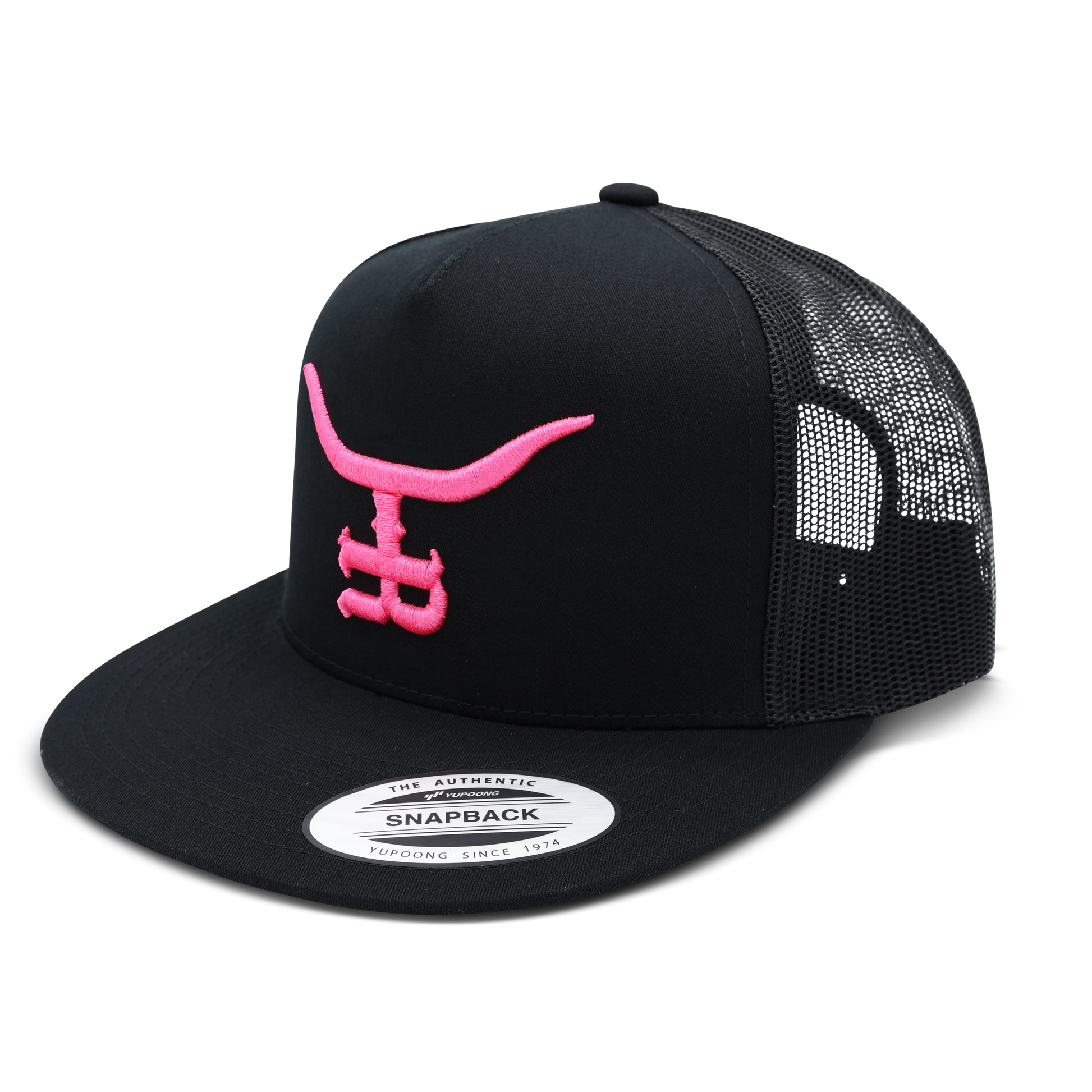 All black Flatbill Trucker Snapback with a pink logo in 3D puff!